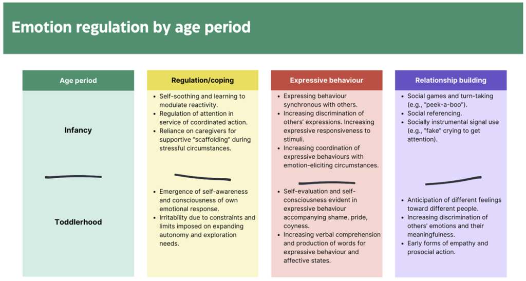 For Child and Youth Care Practitioners (CYCPs) this understanding of how emotions and social interactions develop provide us the foundational knowledge that guides how we support healthy development. While we work with children and youth at various ages, the milestones that can be expected during infancy and toddlerhood allow us to determine areas a child or youth may benefit from developing further. These milestones also inform our practice, as we can adapt our activities, interventions, interactions, and develop relationships to focus on areas of social and emotional development that require attention and further growth.