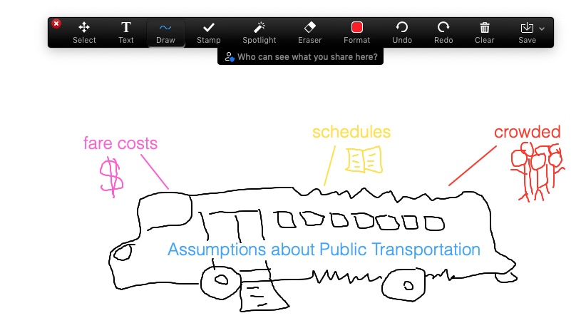 The only application we need is Zoom, which allows the creation of collaborative breakout rooms of 5 to 6 people and which comes with built-in annotation features. In my class, I first demonstrate the annotation features to my students, and then I accompany them as they explore how they can jointly develop their product/project/solution via collaborative visual annotation.
