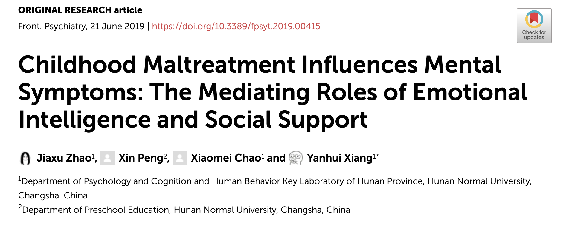 (Zhao, Jiaxu, et al. “Childhood Maltreatment Influences Mental Symptoms: The Mediating Roles of Emotional Intelligence and Social Support.” Frontiers in Psychiatry, vol. 10, 2019, doi:10.3389/fpsyt.2019.00415)