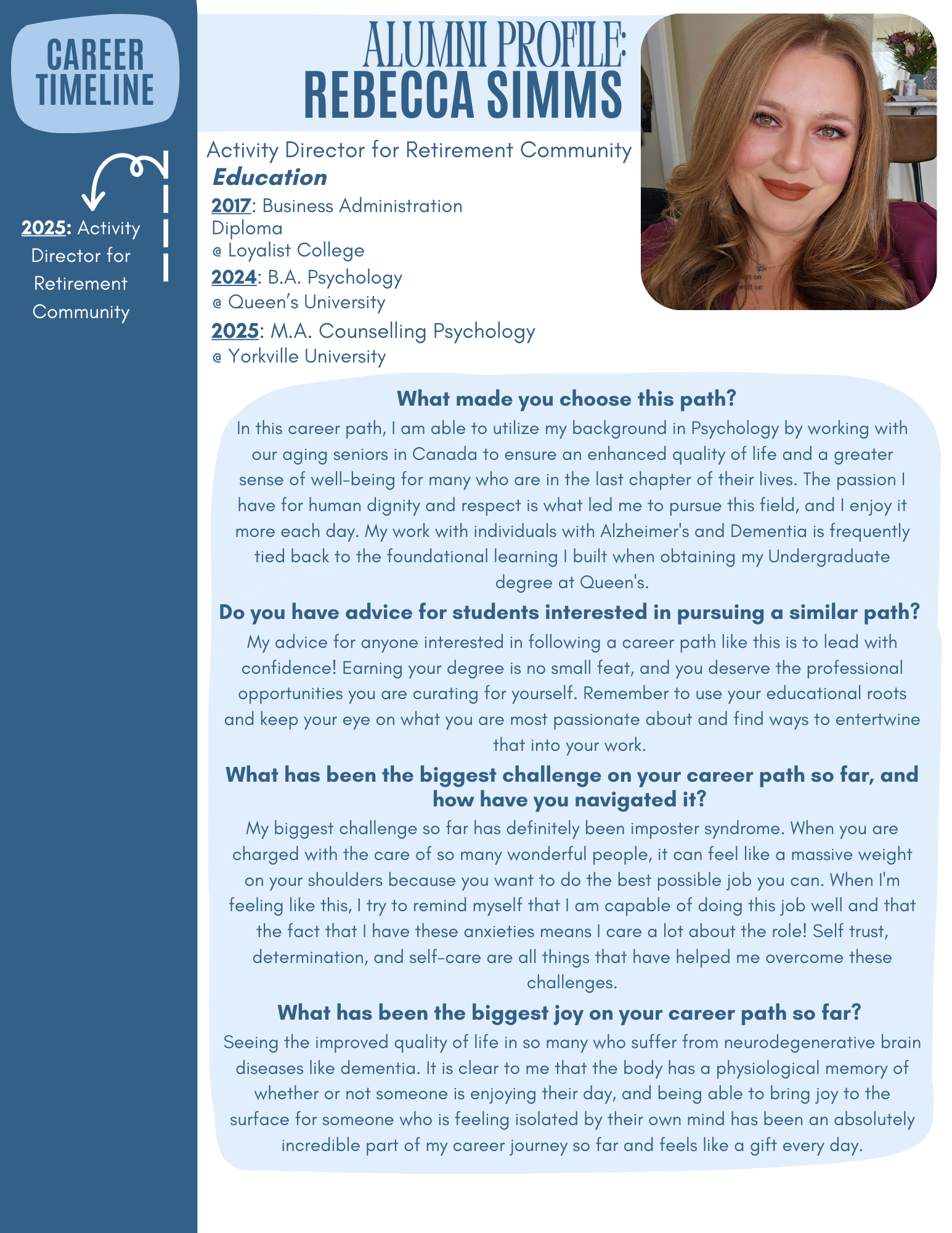 Alumni Profile: Rebecca Simms     Currently, an activity director for retirement community. Education experience: 2017, business administration diploma at Loyalist College. 2024, B.A. in Psychology at Queen’s University. 2025, M.A. in counselling psychology at Yorkville University.      Career timeline: 2025, activity director for retirement community.      What made you choose this path?       In this career path, I am able to utilize my background in Psychology by working with our aging seniors in Canada to ensure an enhanced quality of life and a greater sense of well-being for many who are in the last chapter of their lives. The passion I have for human dignity and respect is what led me to pursue this field, and I enjoy it more each day. My work with individuals with Alzheimer's and Dementia is frequently tied back to the foundational learning I built when obtaining my Undergraduate degree at Queen's.     Do you have advice for students interested in pursuing a similar path?     My advice for anyone interested in following a career path like this is to lead with confidence! Earning your degree is no small feat, and you deserve the professional opportunities you are curating for yourself. Remember to use your educational roots and keep your eye on what you are most passionate about and find ways to entertwine that into your work.     What has been the biggest challenge on your career path so far, and how have you navigated it?     My biggest challenge so far has definitely been imposter syndrome. When you are charged with the care of so many wonderful people, it can feel like a massive weight on your shoulders because you want to do the best possible job you can. When I'm feeling like this, I try to remind myself that I am capable of doing this job well and that the fact that I have these anxieties means I care a lot about the role! Self trust, determination, and self-care are all things that have helped me overcome these challenges.     What has been the biggest joy on your career path so far?     Seeing the improved quality of life in so many who suffer from neurodegenerative brain diseases like dementia. It is clear to me that the body has a physiological memory of whether or not someone is enjoying their day, and being able to bring joy to the surface for someone who is feeling isolated by their own mind has been an absolutely incredible part of my career journey so far and feels like a gift every day.