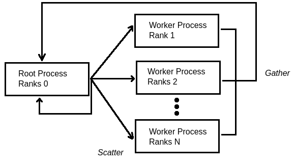 Figure: Diagram showing the flow of messages using the scatter and gather communication framework in MPI.
