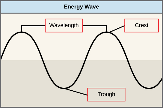 The sun emits an enormous amount of solar energy. The manner in which solar energy travels can be described and measured as waves. Scientists can determine a wave’s energy amount by measuring its wavelength, the distance between two consecutive, similar points in a series of waves, such as from crest to crest or trough to trough (5.3.2). Shorter wavelengths correspond to higher energy, while longer wavelengths have lower energy.