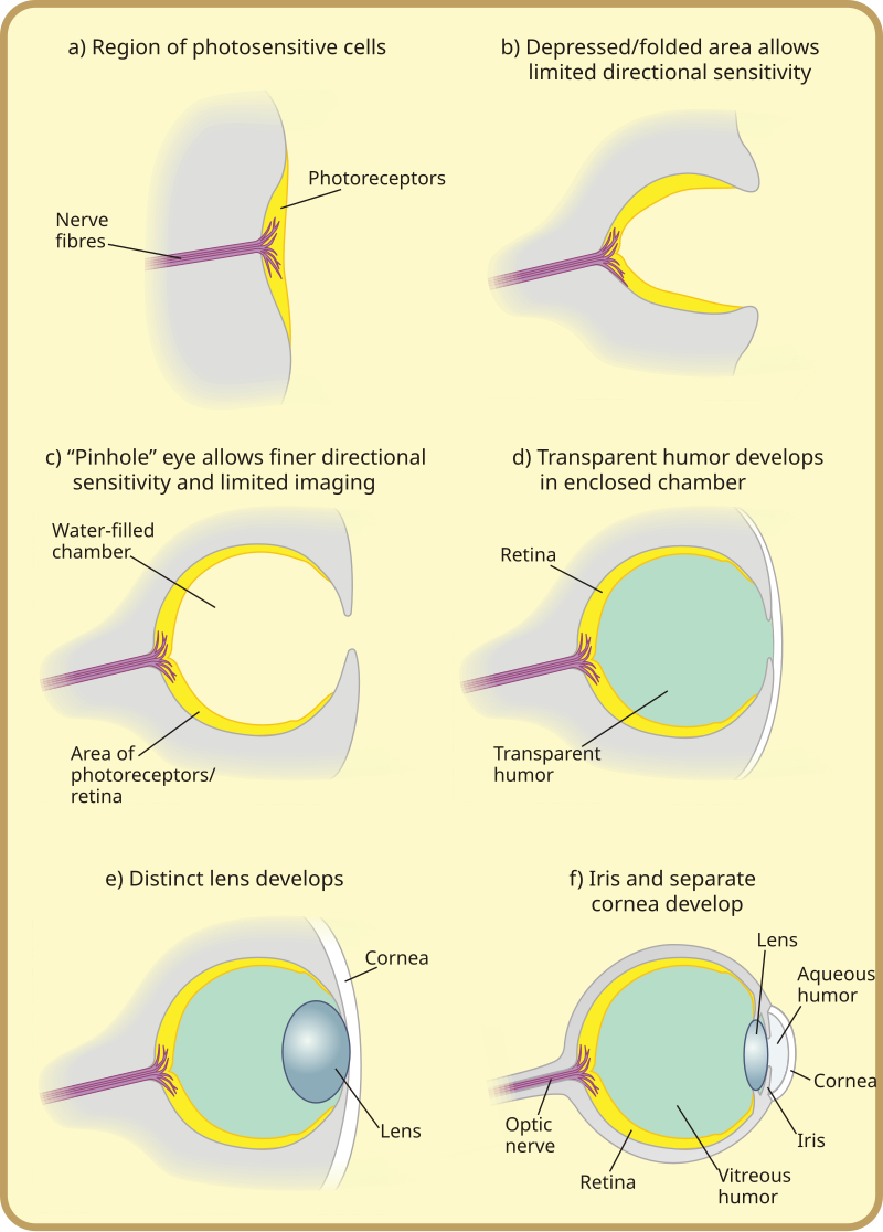 This sequence demonstrates the gradual evolution from simple light-sensitive cells to a complex, image-forming eye.