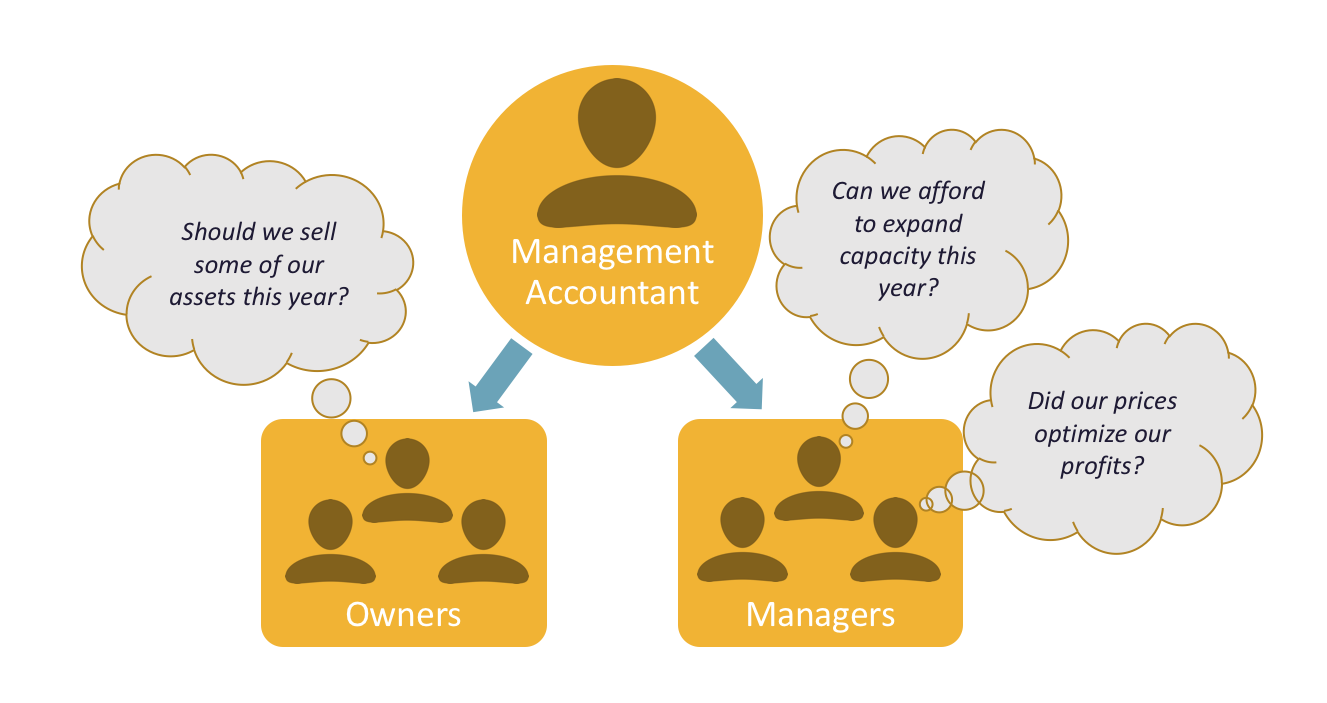 A central gold circle labeled “Management Accountant” with a simple person icon has two blue arrows pointing down to gold rectangles labeled “Owners” (left) and “Managers” (right), each showing three stylized people. A large grey thought bubble from Owners reads, “Should we sell some of our assets this year?” Two grey thought bubbles from Managers read, “Can we afford to expand capacity this year?” and “Did our prices optimize our profits?” illustrating how owners and managers rely on the management accountant for decision-making information.