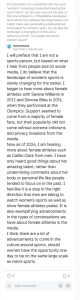 Black Feminism argues that white feminist studies do not apply to Black women. As mentioned within this module, there is a superiority of whiteness upheld which makes any non-white individual treated as an ‘other’. Because of this, Black women have been silenced from speaking on their experiences of discrimination and are not always heard or taken seriously when they do. This type of feminism can relate to Black female athletes that face unfair treatment, which is not equal to that of their white female peers. For example, the case of Sha’Carri Richardson, which I referenced in one of the Padlet posts.