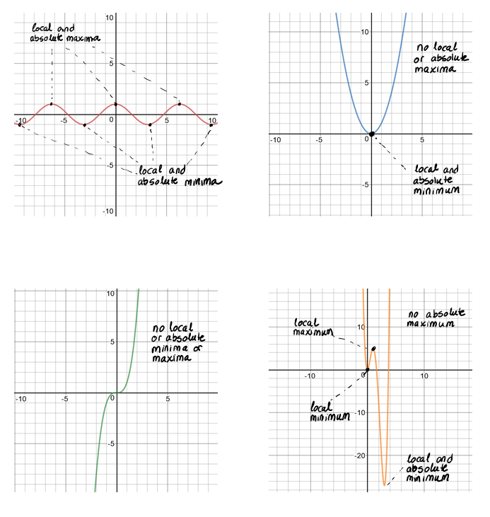 Note that a function can have one or many local and absolute maxima and minima or can have none. Here are some examples: