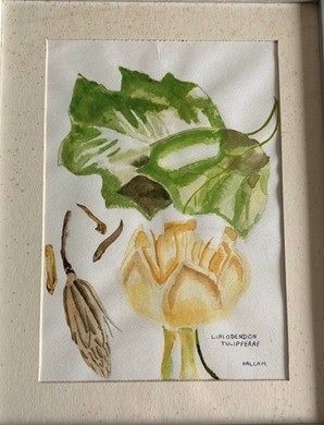 Figure 1.10.10. Artist rendition of a field guide to Liriodendron tulipifera. Art done by Leslie Hallam. [Click to enlarge]