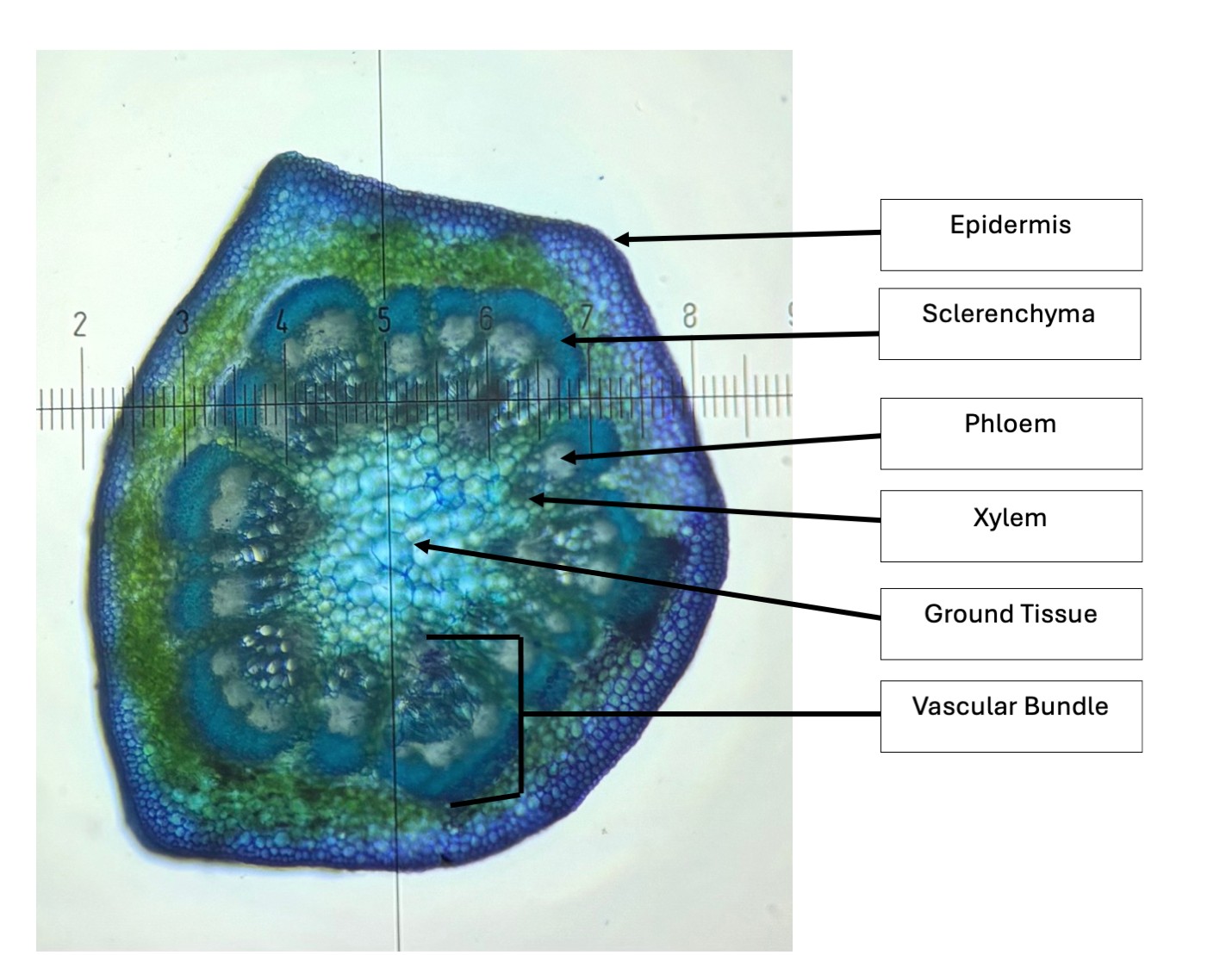 Figure 1.10.9. Stem cross-section of Liriodendron tulipifera, 40× Toluidine O stain. Photo © BIOL-3010 Students, CC BY 4.0. [Click to enlarge]