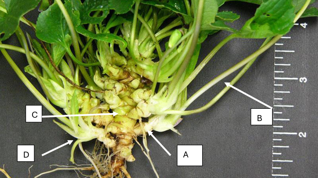 - Shoots: includes nodes and internodes. Nodes are structures where petioles, leaves and flowers emerge from. Internodes are present in Figure 1.7.6, but very compressed due to the new growth. Label B, the petiole, is the stalk that emerges from the node to the leaf. The auxiliary bud is also present, as shown in label D. It gives rise to a petiole.