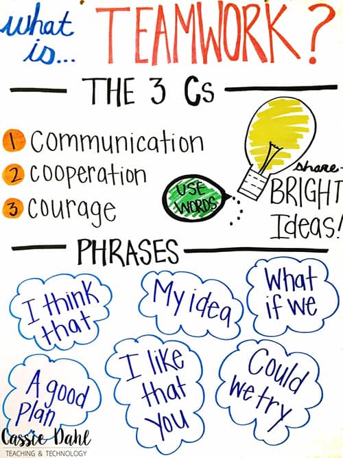 Dahl, C. (2023, August 10). Teamwork anchor chart [photograph]. https://blog.schoolspecialty.com/creating-classroom-collaboration-center-group-work-activities/cassie-dahl-teamwork-anchor-chart/