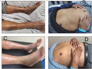 - MRI liver: Diffuse low T1/T2 signal intensity consistent with iron overload (“black liver”)