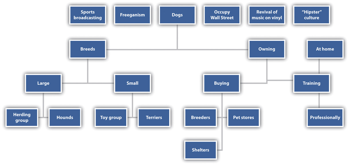 Whether you’ve received parameters that narrow your topic range or not, the first step in choosing a topic is brainstorming. Brainstorming involves generating many potential topic ideas in a fast-paced and nonjudgmental manner. Brainstorming can take place multiple times as you narrow your topic. For example, you may begin by brainstorming a list of your personal interests that can then be narrowed down to a speech topic. It makes sense that you will enjoy speaking about something that you care about or find interesting. The research and writing will be more interesting, and the delivery will be easier since you won’t have to fake enthusiasm for your topic. Speaking about something you’re familiar with and interested in can also help you manage speaking anxiety. While it’s good to start with your personal interests, some speakers may get stuck here if they don’t feel like they can make their interests relevant to the audience. In that case, you can look around for ideas. If your topic is something that’s being discussed in newspapers, on television, in the lounge of your dorm, or around your family’s dinner table, then it’s likely to be of interest and be relevant since it’s current. Figure 9.1 “Psychological Analysis: Attitudes, Beliefs, and Values” shows how brainstorming works in stages. A list of topics that interest the speaker are on the top row. The speaker can brainstorm subtopics for each idea to see which one may work the best. In this case, the speaker could decide to focus his or her informative speech on three common ways people come to own dogs: through breeders, pet stores, or shelters.