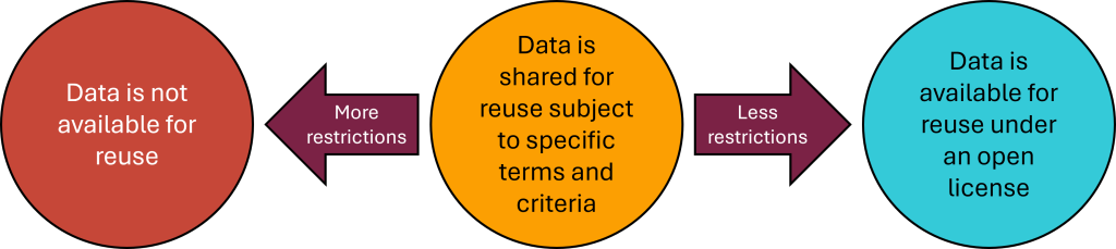 The processes of depositing and sharing your data will require decisions about data access. Data access can be considered on a spectrum from open (data is freely available for anyone to reuse, modify, and redistribute) to closed (data is not distributed beyond the community or the research team). Data access can be granted to varying degrees between these two endpoints.