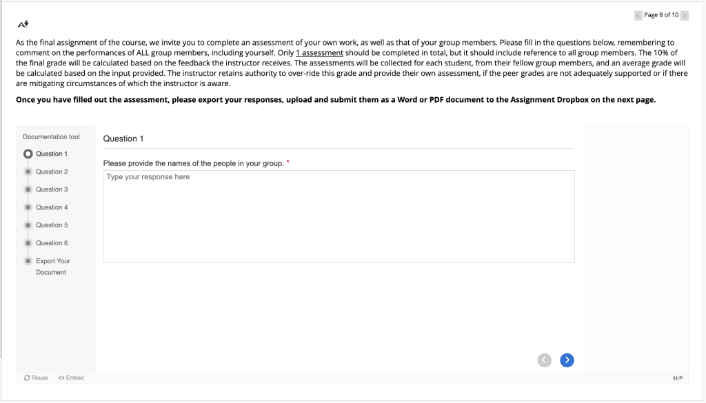 Following the presentation of their idea to the class, students will have the opportunity to submit an independent peer assessment evaluating their own performance throughout the course, as well as that of their fellow group members. The assessments will be collected for each student, from their fellow group members, and an average grade will be calculated based on the input provided. The instructor retains authority to override this grade and provide their own assessment, if the peer grades are not adequately supported or if there are mitigating circumstances of which the instructor is aware.