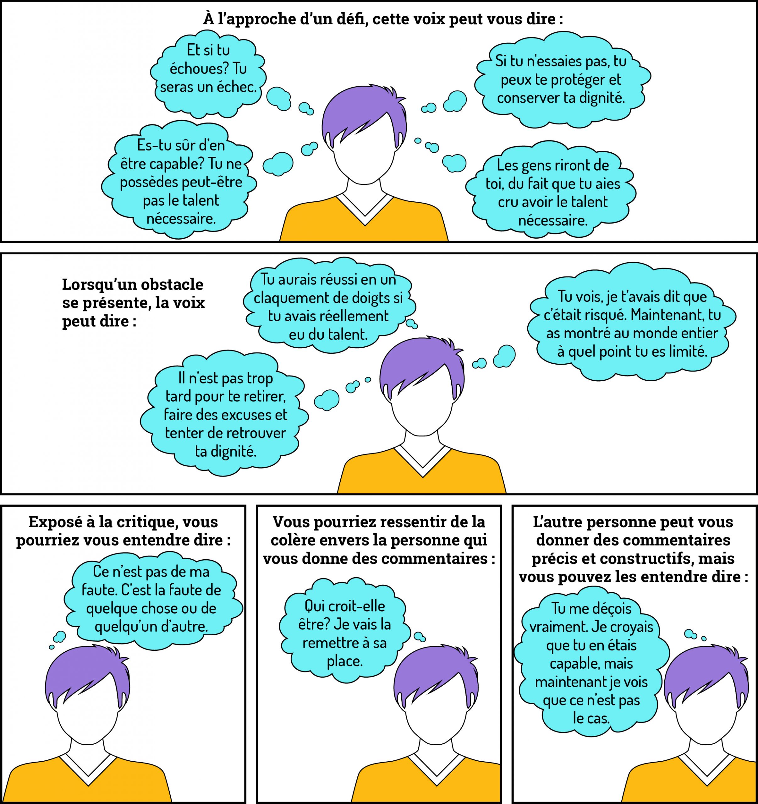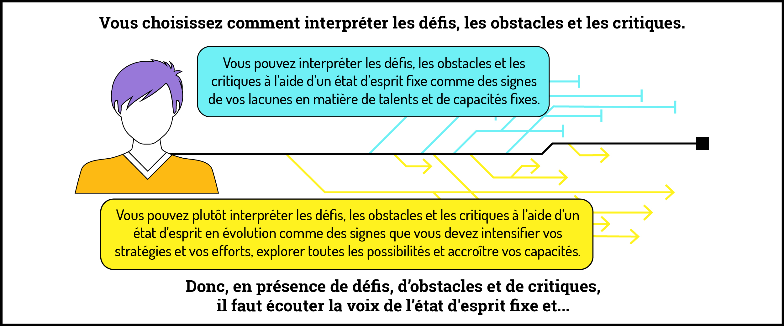 Exercez-vous à écouter les deux et à donner suite à celle de l’état d’esprit en évolution. Évaluez comment cela peut fonctionner pour vous. Au cours des prochaines activités, tâchez d’avoir conscience de la voix que vous entendez.