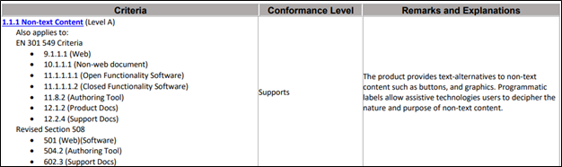 - Il est indiqué que le VPAT « prend en charge » toutes les spécifications d’accessibilité. Bien que cela soit possible, il est incroyablement rare qu’un produit réponde à tous les critères. Cela peut indiquer que l’auteur n’a pas compris ou confirmé la conformité . Veuillez noter qu’un VPAT peut indiquer « Prend en charge » au lieu de « Ne s’applique pas » lorsqu’un critère n’est pas pertinent.