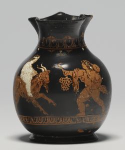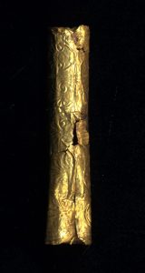 Children and infants are also depicted wearing amulets, using their magical power to protect them in their most vulnerable stage of life. Children also wear amulets under specific ritual conditions, such as the Athenian Anthesteria festival. Consider this red-figure wine jug (choes) with an image of boys celebrating at this festival (Fig. 19.2). The older boy on the right wears a string of amulets around his neck. In this festival dress, the boy wears his infancy amulets for the final time, as he transitions to the status of a youth in society. These amulets were foiled and rolled into amulet casings, such as this gold example in Fig. 19.3. Of all the infants depicted in scenes at the Anthesteria festival, 98% of them are wearing amulet strings. From this statistic, the significance of amulets in youth culture becomes apparent.