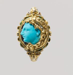 Cameos saw the carver cut away the excess stone, leaving behind a relief figure. This technique was more complex, and unlike the intaglio, the images were meant to be seen and recognized, as illustrated in Fig. 17.4. The craftsman would cut through different layers of stone to distinguish a foreground from the background and were able to include more details, such as hair. A skilled artisan could carve on an overlying stone band so thinly that it would appear transparent, creating light and dark contrast. Cameos were carved strictly to be worn as jewelry and were often set into rings or pendants.