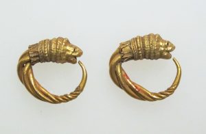 Earrings were the only type of adornment that required a modification to the body. Despite being worn by both sexes in other ancient cultures, Greek women only wore them (see chapter 16 on piercing). Initially, they were simple in design and worn by feeding a fine wire through the earlobe upon which elongated spirals or geometric designs were hung, or they terminated with an animal or god motif, as illustrated in Fig. 17.1.
