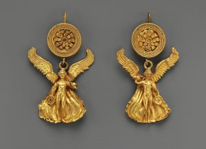 Moving through the archaic and classical periods, styles became more elaborate, involving multiple goldsmithing techniques such as using granulation, as seen in Fig. 17.2, which illustrates a more complex design involving figures hanging from a gold disc and the appearance of more enhanced design techniques. The later classical period and the early Hellenistic times saw a heavy design influence from other cultures, such as Egyptian. As competition for luxury goods increased, craftsmen competed for market share, resulting in greater imagination in design. Common themes during the Hellenistic period were plant and animal motifs, the relationship between Aphrodite and Eros, and winged deities such as Nike.