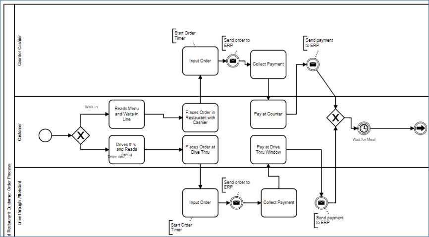 Dans l’exemple ci-dessus, le processus partiel est schématisé dans un groupe intitulé « Processus de commande des clients d’un restaurant de restauration rapide ». Chaque rôle a son propre couloir (activités à couloirs) et chaque rôle est un acteur (personne ou système faisant partie du processus). Le client peut être représenté dans son propre groupe ou dans celui de l’entreprise. Si nous suivons le déroulement du processus, nous constatons qu’il commence avec le client (symbole de départ), puis que celui-ci prend la décision (passerelle Xor) d’utiliser le service au volant ou d’entrer dans le restaurant pour manger. La commande est ensuite passée à l’acteur correspondant (employé), qui l’enregistre dans le système de gestion des ressources de l’entreprise (ERP) et collecte le paiement du client. La commande et les détails du paiement sont envoyés au ERP (diagramme dans son propre couloir). Ensuite, le flux de processus se rétablit (passerelle convergente) et le client attend son repas (minuterie). Selon vous, quelle serait la prochaine étape? C’est en quelque sorte une question piège, car de nombreuses choses se produisent pendant que le client attend.