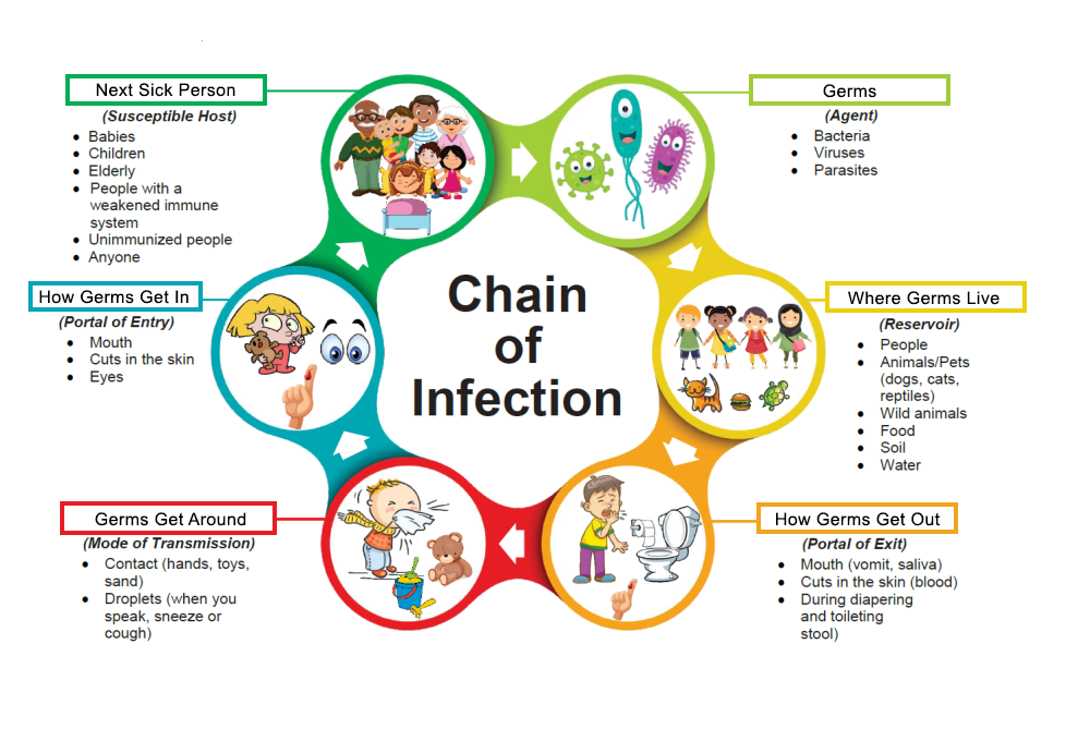 Germs Get Around (Mode of Transmission) – Contact (hands, toys, sand), Droplets (when you speak, sneeze, or cough)