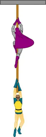 - Figure 4.44 shows Superhero and Trusty Sidekick hanging motionless from a rope. Superhero’s mass is 90.0 kg, while Trusty Sidekick’s is 55.0 kg, and the mass of the rope is negligible. (a) Draw a free-body diagram of the situation showing all forces acting on Superhero, Trusty Sidekick, and the rope. (b) Find the tension in the rope above Superhero. (c) Find the tension in the rope between Superhero and Trusty Sidekick. Indicate on your free-body diagram the system of interest used to solve each part.