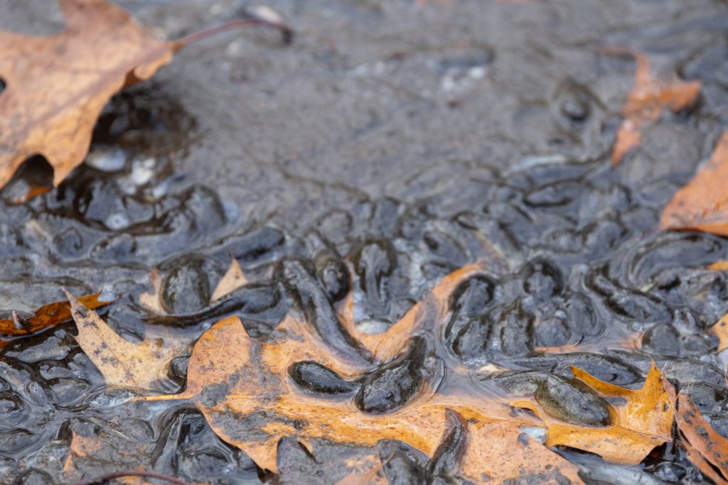 Green frog (Lithobates clamitans) tadpoles stranded in a drying pond. Green frog tadpoles metamorphose in their second year so this species tends to breed in larger more permanent wetlands. Breeding in small wetlands has some benefits like warmer temperatures and fewer predators but may completely dry out before the tadpoles have metamorphosed. Photo: G. Bulté