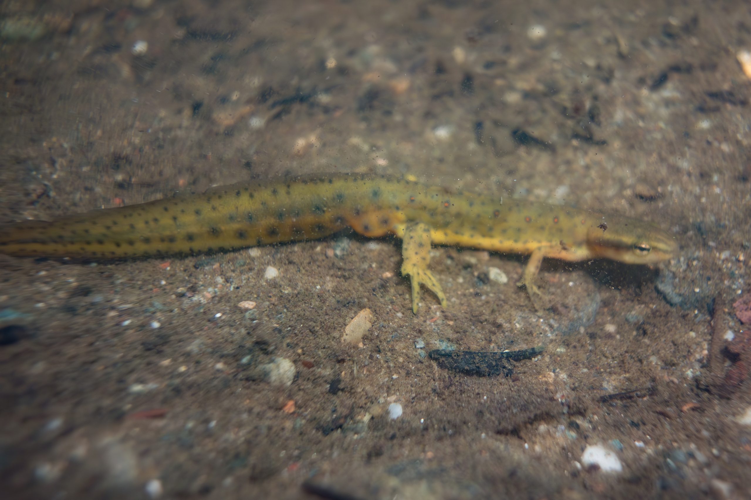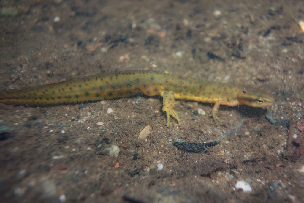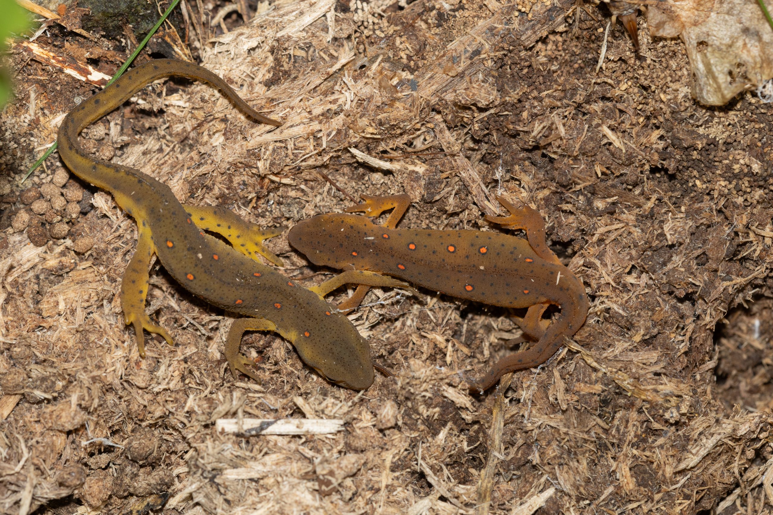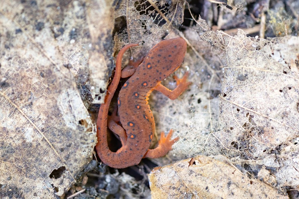 Adult red spotted newt in a terrestrial phase. These adult newts migrated on land to overwinter and have undergone a partial transformation. Photo: G. Bulté.