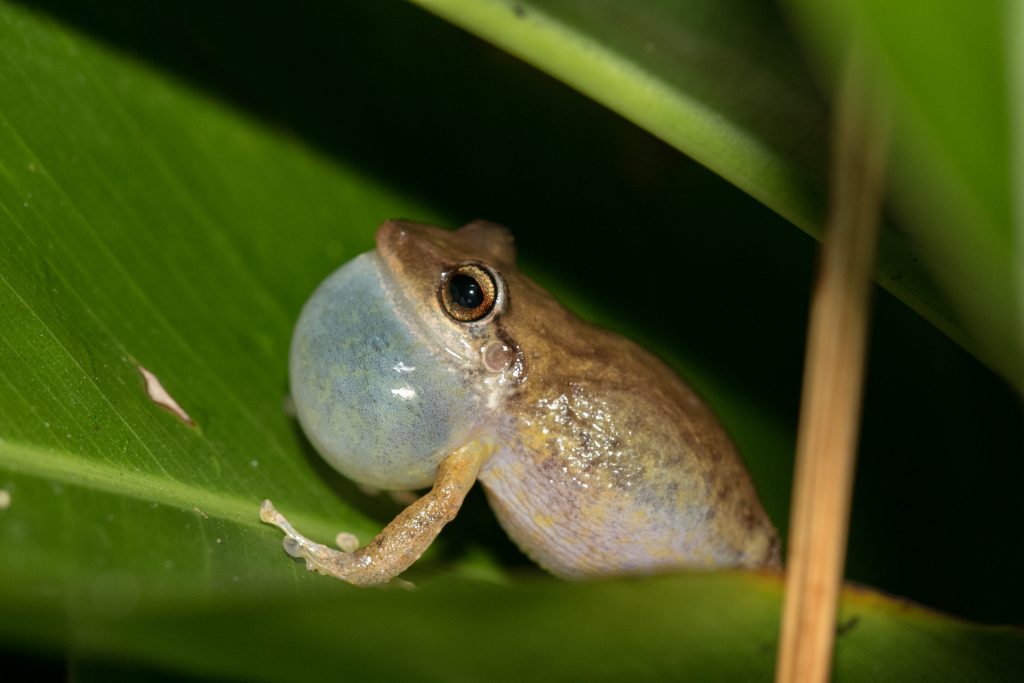 Male Coqui calling. The tadpole stage in the Coqui (Eleutherodactylus sp.) occurs entirely inside the eggs which are laid on land. Photo: G. Bulté.
