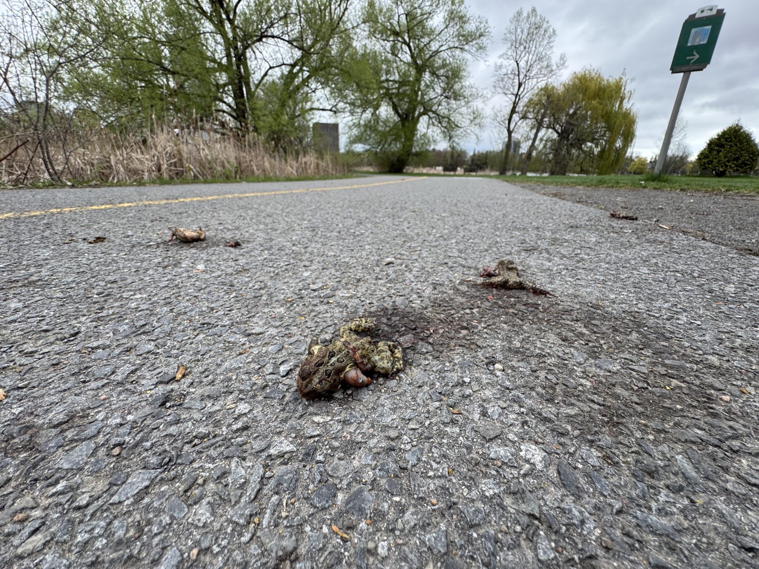 The mass migration of amphibians to breeding ponds can make certain populations ans species vulnerable to road mortality. Even crossing bike paths can be lethal as shown by these American toads squashed on the Domininon arboretum bike path in Ottawa. Photo. G Bulté.
