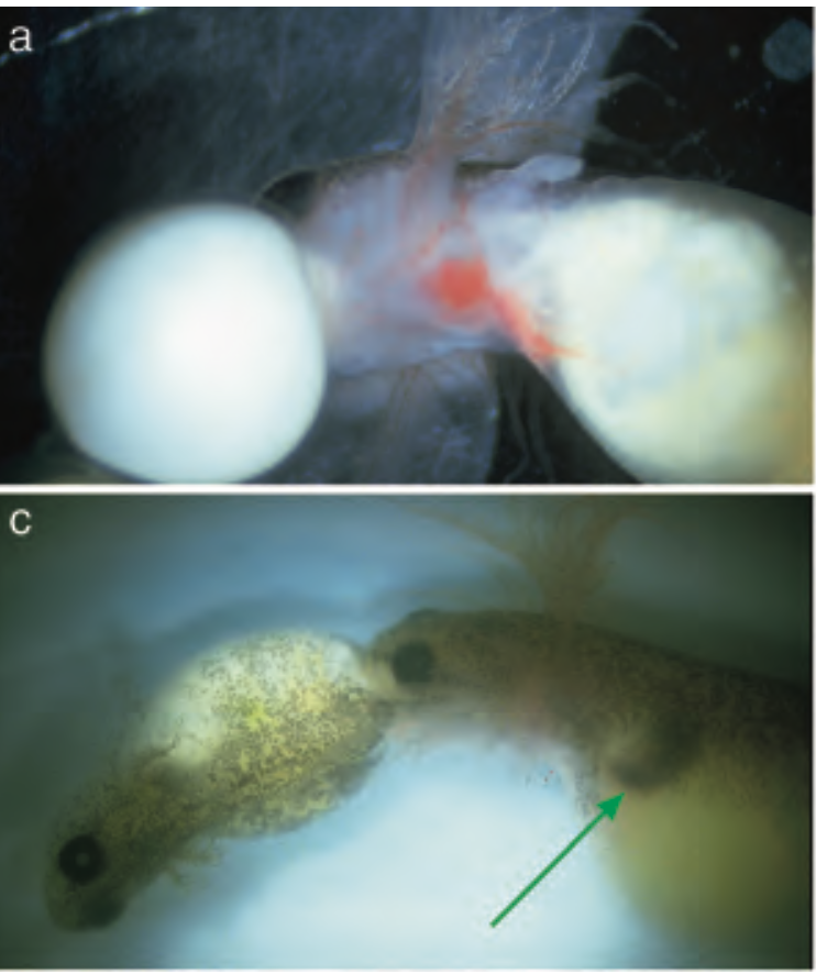 Metamorphosis is most dramatic in frogs in which a limbless, gill-breathing, herbivorous fish-like creature turns into a terrestrial predator with massive limbs and lungs in a matter of days.  Frog larvae are in fact so different from the adults that we don’t call them frogs. We call them tadpoles. Tadpoles need to develop lungs, limbs, jaws, teeth, eyelids, a tongue, and a new digestive system among other traits.