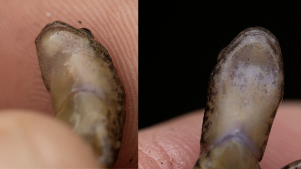 Left: Chin of a male northern two-lined salamander Male during the mating season showing the mental gland. Left. Chin northern two-lined salamander not during mating season. Photos: G. Bulté.