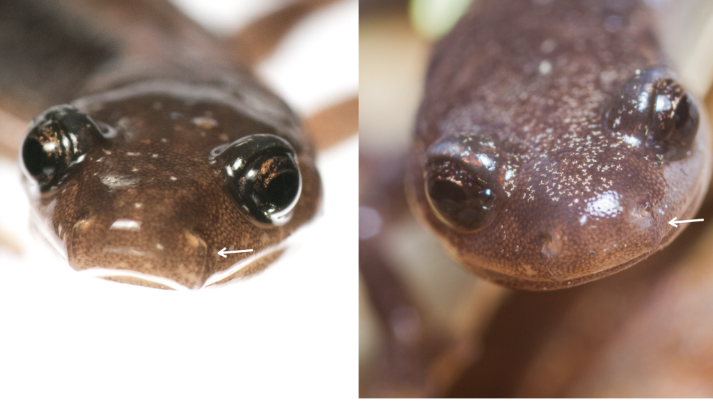 Nasolabial grooves (white arrows) in male (left) and female red-backed salamander (Plethodon cinereus). Note the difference in the shape of the snout. Photo: G. Bulté