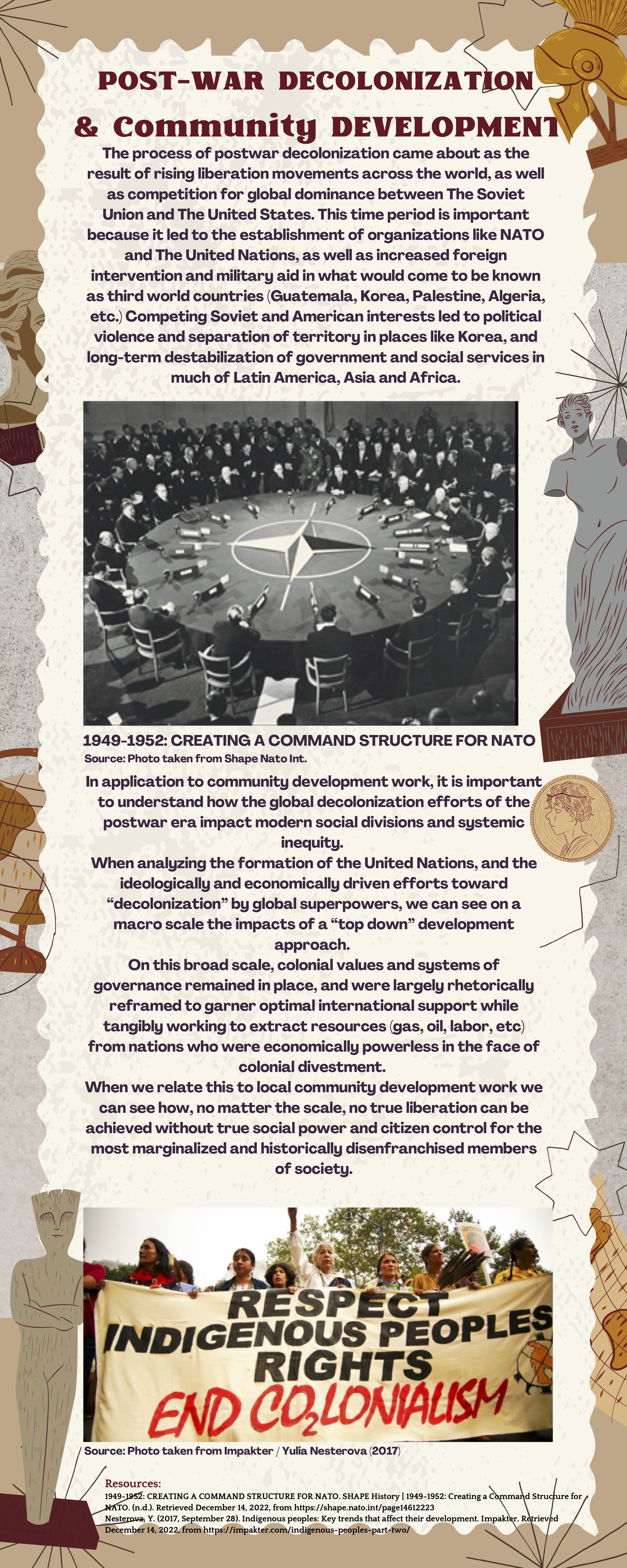 In application to community development work, it is important to understand how the global decolonization efforts of the postwar era impact modern social divisions and systemic inequity. When analyzing the formation of the United Nations, and the ideologically and economically driven efforts toward “decolonization” by global superpowers, we can see on a macro scale the impacts of a “top down” development approach. On this broad scale, colonial values and systems of governance remained in place, and were largely rhetorically reframed to garner optimal international support while tangibly working to extract resources—gas, oil, labor, etc.—from nations who were economically powerless in the face of colonial divestment. When we relate this to local community development work we can see how, no matter the scale, no true liberation can be achieved without true social power and citizen control for the most marginalized and historically disenfranchised members of society.