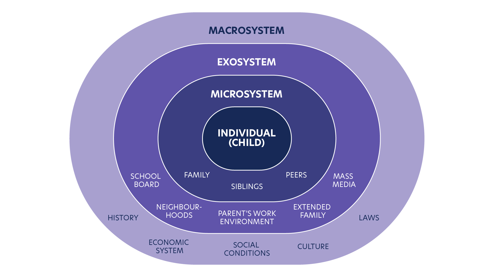 Systems rarely exist in a void. They overlap and can be understood as “nested” in various ways that are relevant when it comes to social innovation. The figure below takes the example of a child to illustrate how systems generally interrelate across four different levels of nesting: