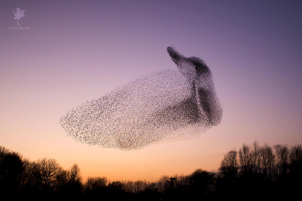 A murmuration is a sort of shapeshifting, morphing swarms of starlings. A murmuration is an emergent phenomenon: each of the movements of a murmuration look coordinated, but the it is the results of each bird following, at an individual or local level, a set of simple rules.