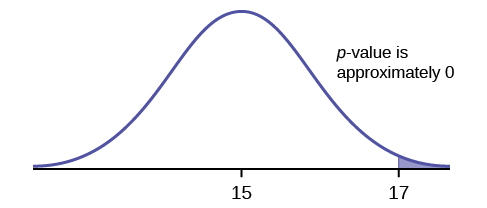 Suppose the null hypothesis is true. That is, suppose [latex]\mu=15[/latex]. Under this assumption, we have to ask if the sample mean of [latex]17[/latex] is likely or unlikely to occur. The hypothesis test works by asking the question of how unlikely is this sample mean if the null hypothesis is true. The graph shows how far out the sample mean is on the normal curve. The [latex]p-\text{value}[/latex] is the probability that, if we took another sample of size [latex]10[/latex], any other sample mean would fall at least as far out as [latex]17[/latex] cm.