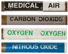Medical gas piping, including all intakes, exhausts and vents, must be clearly identified using non-removable stickers that are colour coded to specify the gas it conveys. Colours are standardized according to the CSA Z7396.1 Standard (Figure 31).