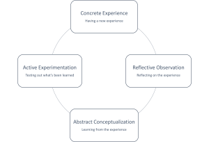 - Active experimentation – finally, or in perpetual cycle, the student will extend and apply those reflections to subsequent experiences, try out new ways of encountering and engaging in those experiences based on the newly acquired insights.