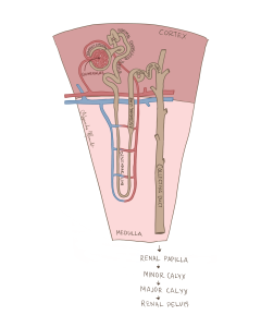 The collecting ducts eventually converge at the renal papilla, where urine is funnelled into a structure called the minor calyx. The minor calyx is lined with transitional epithelium, allowing it to stretch and accommodate urine from several nephrons. Several minor calyces converge to form a larger drainage structure called the major calyx and multiple major calyces drain into – you guessed it – an even larger structure called the renal pelvis. This gradual increase in the size of drainage structures is similar to how blood flows from capillaries to venules to veins, as thousands of nephrons must eventually drain out to a single renal pelvis in each kidney.