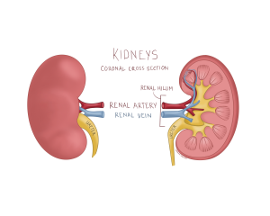The focal point of the renal system are the kidneys, two bean-shaped organs located on the posterior side of the abdominal wall. Blood reaches the left and right kidneys via the corresponding renal arteries, which branch directly from the aorta. Once blood has been filtered, it returns to systemic circulation via the left and right renal veins. Blood vessels enter and exit the kidneys through the renal hilum, the inner, concave portion of the kidney. The ureters, which transport urine from the kidneys to the bladder, also pass through the renal hilum.