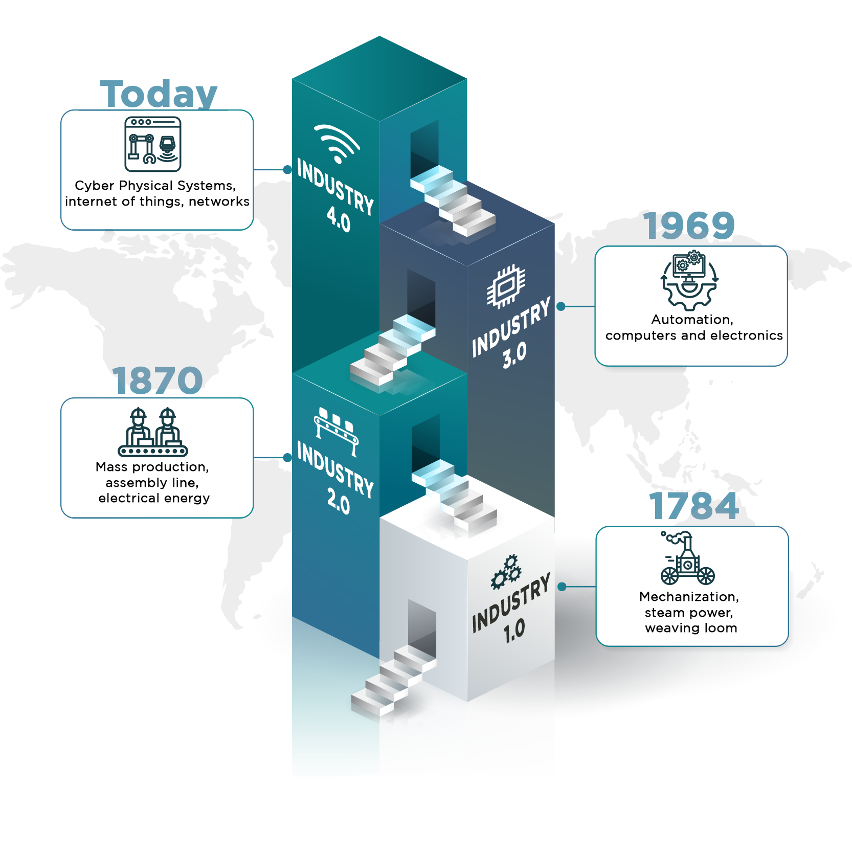 An infographic depicting the evolution of industrial revolutions. It features a 3D structure with four levels. The bottom level, ‘INDUSTRY 1.0,’ dated 1784, mentions mechanization, steam power, and the weaving loom. The second level, ‘INDUSTRY 2.0,’ dated 1870, refers to mass production and electrical energy. The third level, ‘INDUSTRY 3.0,’ dated 1969, highlights automation, computers, and electronics. The top level, ‘INDUSTRY 4.0,’ dated today, includes cyber-physical systems, the internet of things (IoT), and networks.