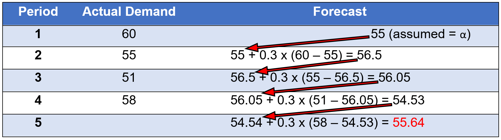 In this example, period 5 is the next period for which we are looking for a forecast. In order to have that, we will need the forecast for the last period (i.e., period 4). But there is no forecast given for period 4. Thus, we will need to calculate the forecast for period four first. However, a similar issue exists for period four since we do not have the forecast for period 3. So, we need to go back for one more period and calculate the forecast for period 3. As you see, this will take us all the way back to period 1. Because there is no period before period 1, we will need to make some assumptions for the forecast of period 1. One common assumption is to use the same demand of period 1 for its forecast. This will give us a forecast to start, and then we can calculate the forecast for period two from there. Let’s see how the calculations work out: