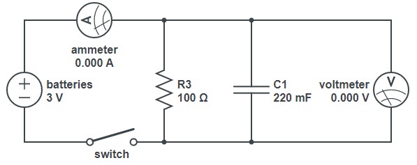 - CLOSE the switch and the batteries will charge the capacitor. The voltmeter should be reading the full voltage of the batteries: 3 V.
