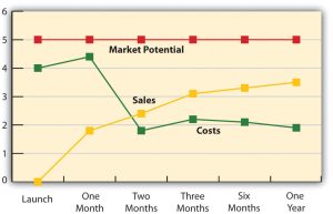 Note that Figure 16.8 “A Marketing Plan Timeline Illustrating Market Potential, Sales, and Costs” shows that the product’s costs are high early on and then decrease before levelling out. That cost line assumes there is a heavy upfront investment to launch the offering, which is usually true for new products. The sales of the offering should grow as it gathers momentum in the market. However, the market potential stays the same, assuming that the potential number of customers stays the same. That might not always be the case, though. If we were targeting mothers of babies, for example, the market potential might vary based on the projected seasonality in birth rates because more babies tend to be born in some months than others.