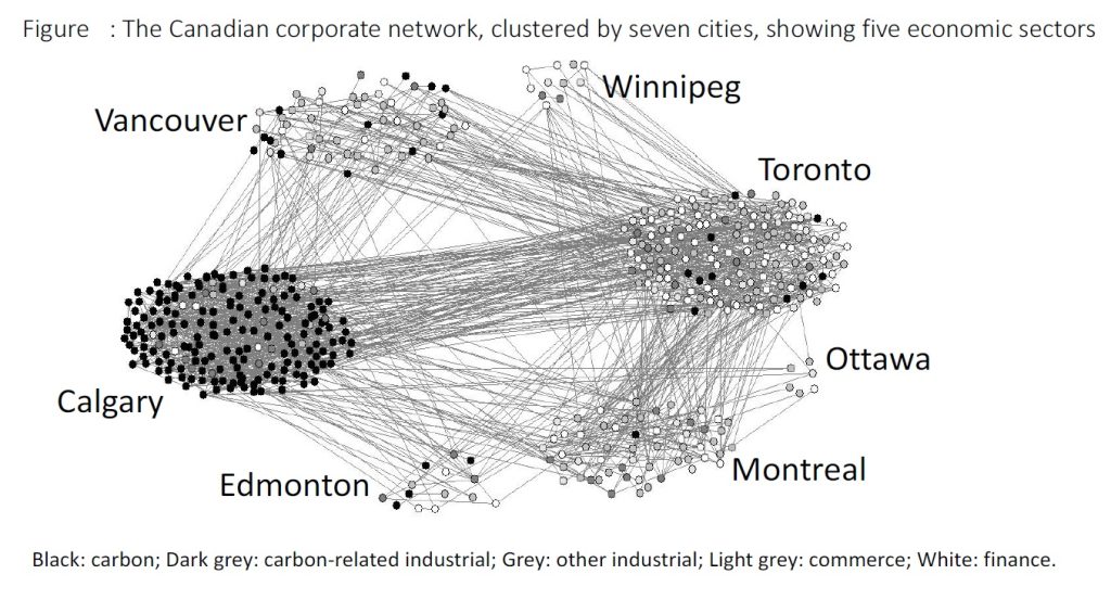 - Figure 10.19 The Canadian corporate network, clustered by seven cities, showing five economic sectors. by William Carroll (2021, p. 152), via AU Press is used under a CC BY-NC-ND 4.0 licence.