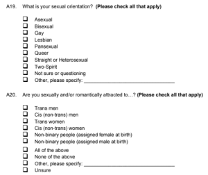 For example, Trans PULSE Canada asks multiple overlapping questions about sexual orientation (e.g., asexual, pansexual, queer, Two-Spirit, questioning) and includes a separate measure of sexual and romantic attration (e.g., attraction to cisgender men, transgender women, non-binary people). These distinctions recognize that identity and attraction do not always align and allow for a richer understanding of lived experiences.