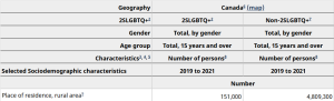 Using publicly available (aggregate data from Statistics Canada, find the number of 2SLGBTQ+ versus non-2SLGBTQ+ individuals aged 15+ who lived in rural areas in Canada?