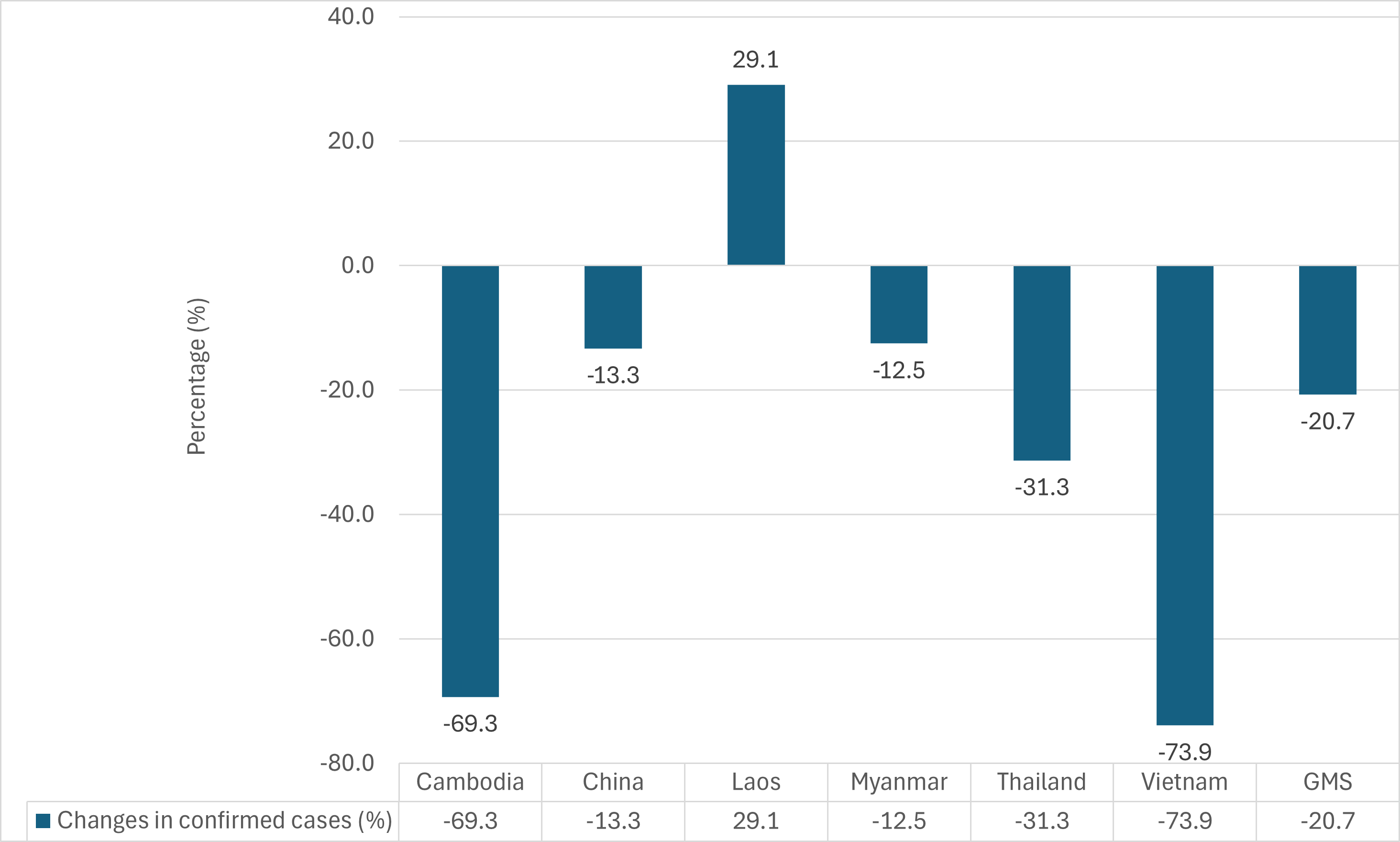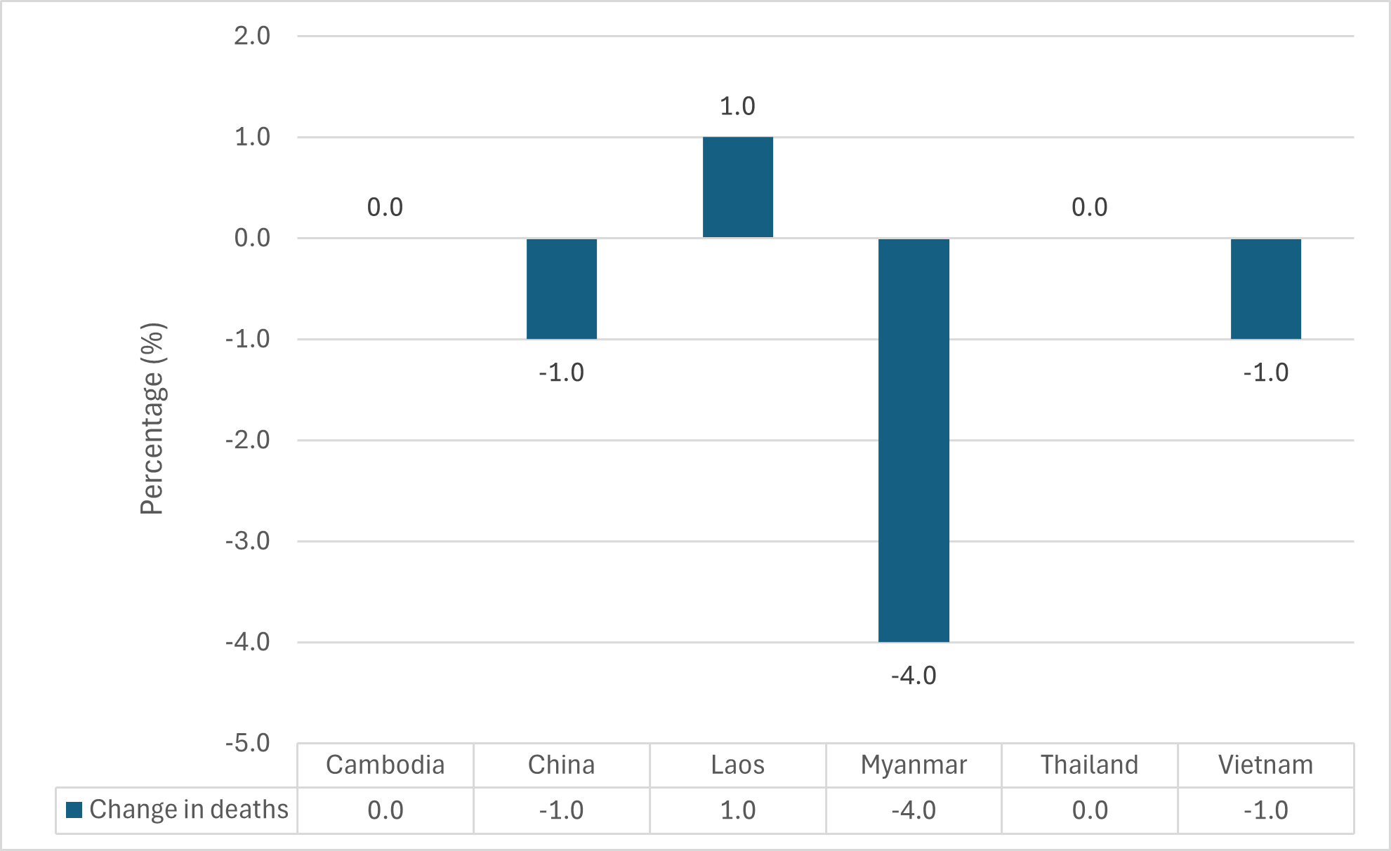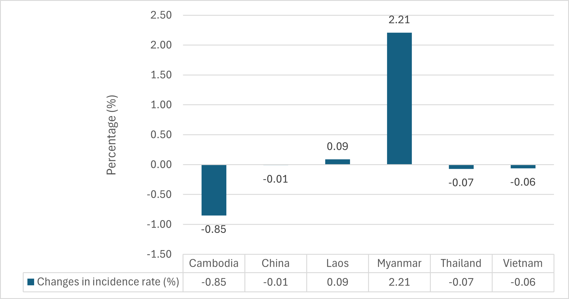 It should be noted that in 2020, the effectiveness of the program stagnated across GMS countries as malaria-related conditions did not experience a drop in accordance with previous recent years (WHO, 2021a). This could be attributed to external factors, not least the COVID-19 pandemic (WHO, 2021b). Concerning incidence rate, Figure 9 shows a sharp downturn in Cambodia (-0.85%), while China (-0.01%), Thailand (-0.07%) and Vietnam (-0.06%) all saw a more modest change. Although Myanmar reported improvements in managing mortality from malaria, this country’s rising incidence rate of 2.21% remains a major cause for concern.